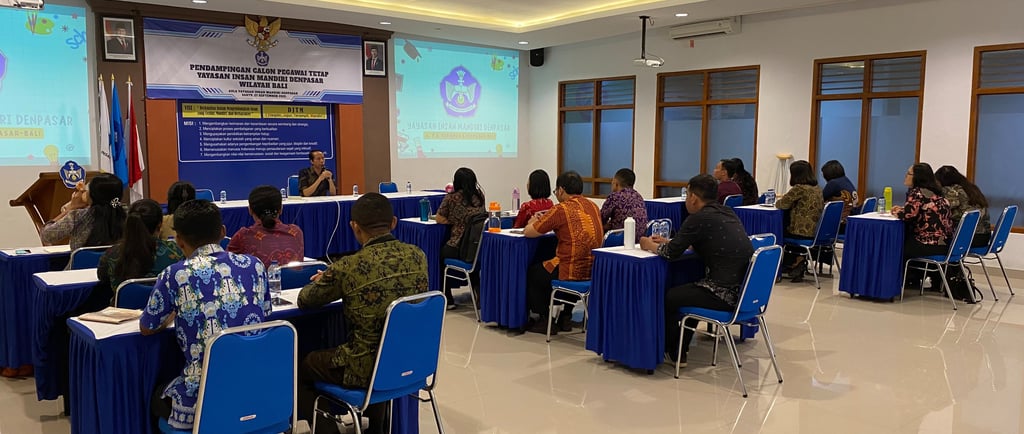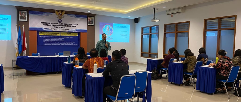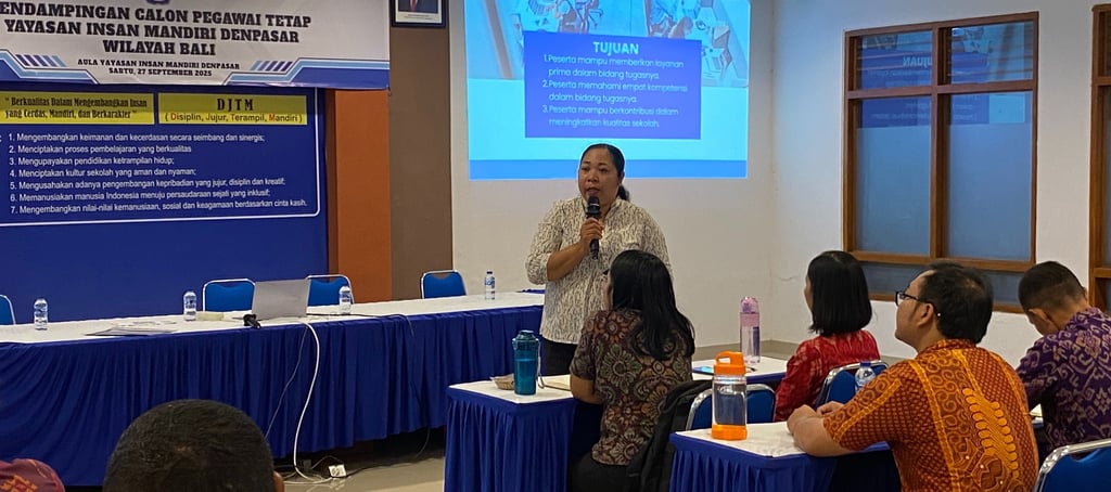 Denpasar, 27 September 2025 – Suasana penuh semangat dan sukacita tampak sejak pagi di Aula Yayasan Insan Mandiri Denpasar. Para calon pegawai tetap dari berbagai unit sekolah hadir dengan antusias untuk mengikuti Kegiatan Pendampingan Calon Pegawai Tetap Yayasan Insan Mandiri Denpasar Wilayah Bali. Acara ini bukan sekadar agenda pendampingan formal, melainkan sebuah proses pembinaan dan permenungan bersama. Melalui kegiatan ini, para calon pegawai tetap diajak untuk memperdalam semangat pelayanan yang berlandaskan kasih, iman, dan profesionalitas, sehingga peran pendidik dan tenaga kependidikan tidak hanya sebatas pekerjaan, tetapi juga menjadi bagian dari misi pendidikan Kristiani yang hidup dan nyata di tengah masyarakat.