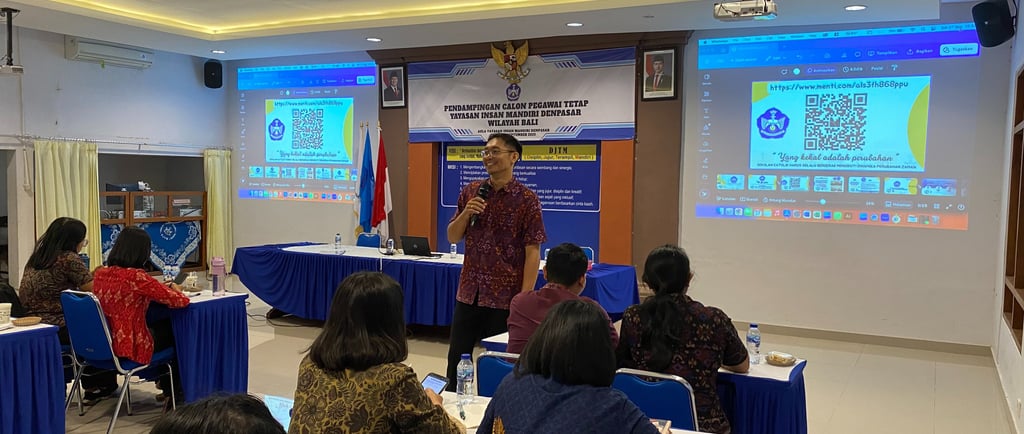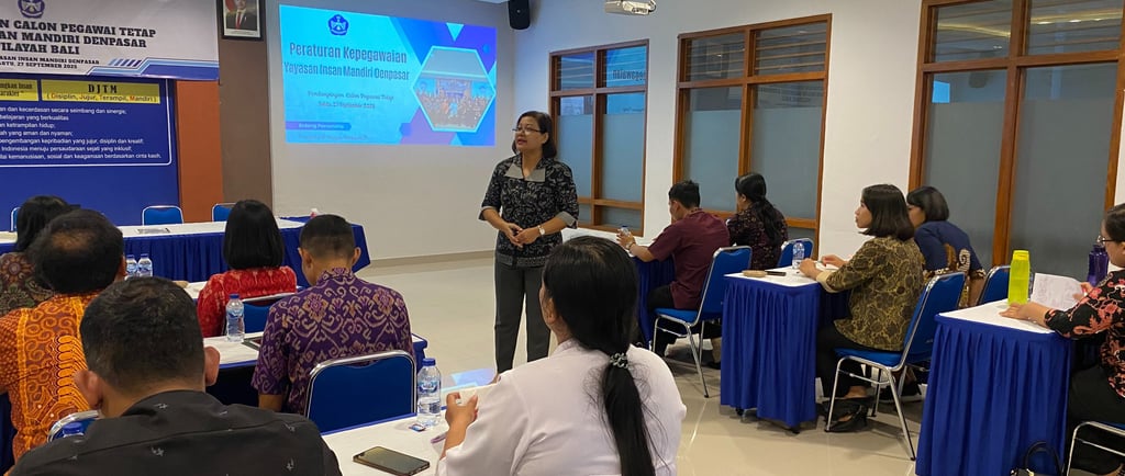 Setelah istirahat makan siang, acara dilanjutkan dengan sesi Kepegawaian Yayasan Insan Mandiri Denpasar bersama Kepala Bidang Personalia Yayasan Insan Mandiri Denpasar, Fransiska Ni Wayan Herawati, S.T. Dalam sesi ini, peserta mendapatkan pemahaman yang mendalam mengenai berbagai aspek terkait kepegawaian, termasuk dasar hukum, peraturan, hak, serta kewajiban setiap pegawai sebagai bagian dari keluarga besar Yayasan Insan Mandiri Denpasar. Ibu Hera menekankan pentingnya disiplin, tanggung jawab, dan profesionalisme dalam menjalankan tugas, sekaligus menegaskan bahwa setiap pegawai, baik guru maupun tenaga kependidikan memiliki peran yang sama penting dalam mendukung kelancaran operasional dan tercapainya visi-misi Yayasan Insan Mandiri Denpasar. Selain itu, sesi ini juga membahas prosedur administratif, mekanisme penilaian kinerja, serta berbagai fasilitas dan program pengembangan yang disediakan bagi pegawai tetap, sehingga peserta tidak hanya memahami hak dan kewajibannya, tetapi juga mendapatkan gambaran jelas tentang jalur pengembangan karier di Yayasan Insan Mandiri Denpasar.