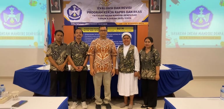 Denpasar, 3 September 2025 – Yayasan Insan Mandiri Denpasar menyelenggarakan kegiatan Evaluasi dan Revisi Program Kerja RAPBS dan RKAS Tahun Ajaran 2025/2026. Kegiatan penting ini diikuti oleh seluruh Kepala Sekolah, Wakil Kepala Sekolah atau perwakilan guru, serta staf Tata Usaha dari unit-unit pendidikan di bawah naungan Yayasan Insan Mandiri Denpasar, yang tersebar di wilayah Bali, Lombok, dan Sumbawa.