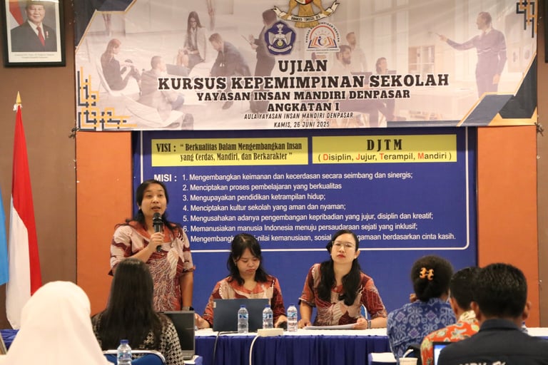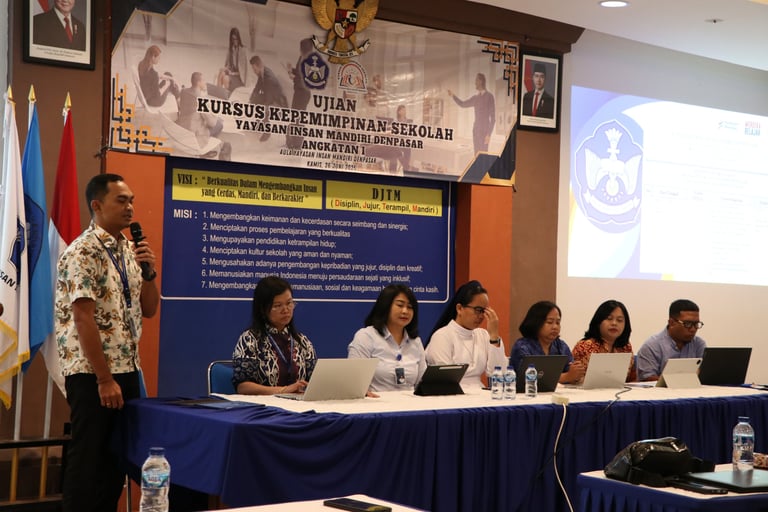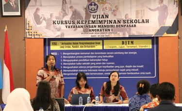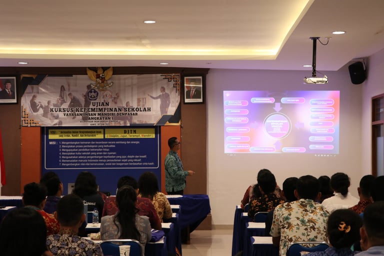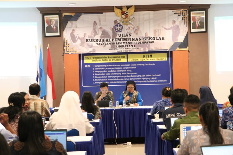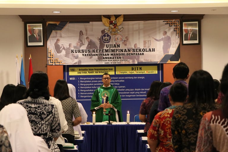 Denpasar, 26 Juni 2025 – Dalam semangat menyemai pemimpin pendidikan yang visioner dan berdedikasi, Bidang Personalia Yayasan Insan Mandiri Denpasar menyelenggarakan Ujian Kursus Kepemimpinan Sekolah merupakan puncak dari program Kursus Kepemimpinan Sekolah. Kegiatan ini tidak hanya bertujuan mencetak pemimpin yang kompeten secara manajerial, tetapi juga menginternalisasi nilai-nilai Kristiani, dengan meneladani Yesus Kristus, Sang Guru Agung, yang menjadi teladan utama dalam pelayanan, kasih, dan kebijaksanaan.